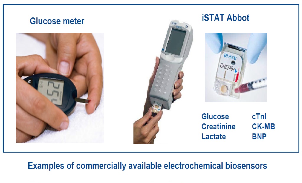 Electrochemical biosensors are among the most commonly used nowadays thanks to their portability, cost effectiveness, small size, rapidity, and robustness. Additionally, electrochemical transducers and equipment are relatively easy to miniaturize into multiplexed platforms, which coupled to integrated microfluidics is highly compatible with multi-analyte testing. This favours the development of point-of-care (POC) devices, to be used directly by the patient or at the surgery. The two clearest examples are probably the glucose electrochemical biosensor, which has facilitated life to diabetic patients to a great extend, and the hand held i.STAT clinical analyser (Abbot), which combines several electrochemical biosensors on a single chip and is used for multiple electrolytes and metabolites in clinical samples.