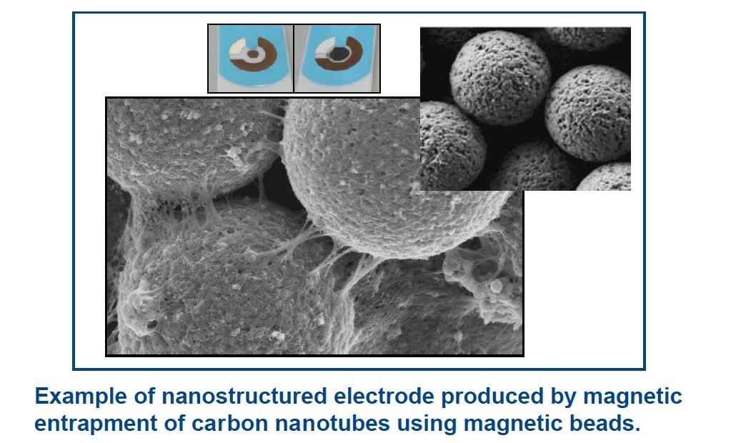 We recently demonstrated that CNT dispersed in aqueous media have a strong tendency to adsorb non-specifically onto the surface of magnetic particles (MP). The resulting MP/CNT composite can then be arranged onto an electrode using a magnet, which is extremely fast, simple and reversible, allowing easy electrode regeneration/reutilisation. CNT magnetic co-entrapment can then serve to produce nanostructured electrodes of enhanced performance, but has been also applied to the electrochemical monitoring of the MP surface itself. In this context, CNT serve as wires that connect MP between them and with the electrode and allow the electrochemical detection of any electroactive targets and labels that have been previously bound to the MP surface. For instance, we have shown that dopamine, an electroactive neurotransmitter, could be first immunocaptured and concentrated using specific MP, which eliminates interference by non-targeted sample components, followed by CNT magnetic co-entrapment onto an electrode, which promotes surface electrical wiring and allows straightforward electrochemical sensing of the captured molecule.