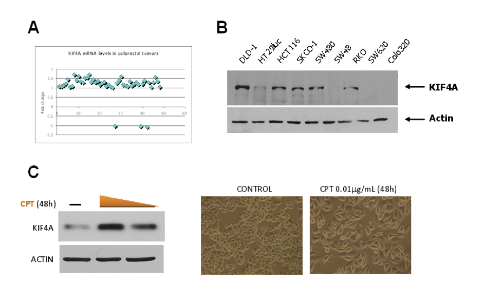 Figure 1: Condensin interactors. Expression and its sensitivity to camptothecin. A) Condensin-interactor was found to be overexpressed in 24 out of 48 colorectal cancer (CRC) samples analyzed by expression microarrays. B) protein expression was further confirmed by Western Blot analysis in a panel of CRC cell lines. C) Furthermore, Camptothecin (CPT), a drug commonly used in the treatment of CRC, increased the expression of the protein in HeLa cells, suggesting that this interactor could be used as aresponse prediction factor for CPT treatments