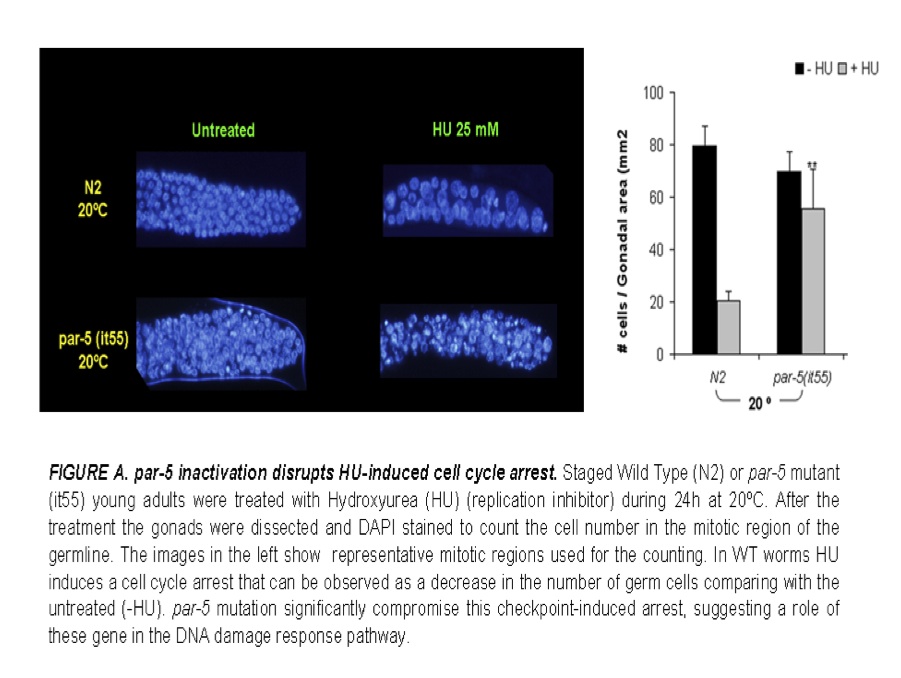 This research line is focused into the identification of new signal transducers involved in DNA damage control pathways which are the main responsible of controlling cell death and repair mechanisms. We are also studying their alterations and biological involvement in tumor cell development and metastasis spread, together with the consequences excerted at the level of tumor treatment response to classical and non-classical chemotherapy. Validation of new checkpoint targets are also done in C.elegans models by using hydroxyurea treatments and specific transgenic mutants and siRNA of target genes.
