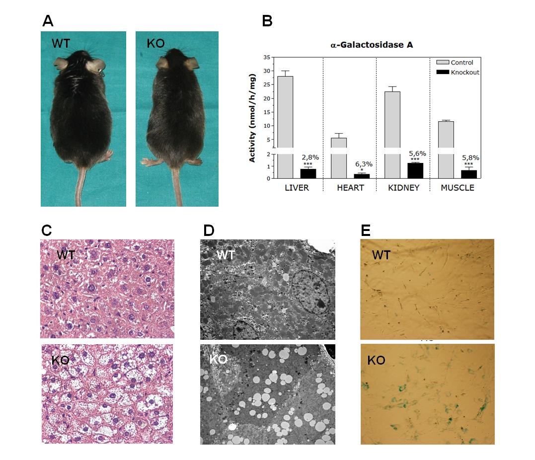 Figure 2: Characterization of the Fabry KO mice. A) Overall phenotype, B) GLA activity, C) Liver histology, D) Lysosomal deposits shown by electronic microscopy, and E) Senescence (b-Gal staining) in primary endothelial cultures.
