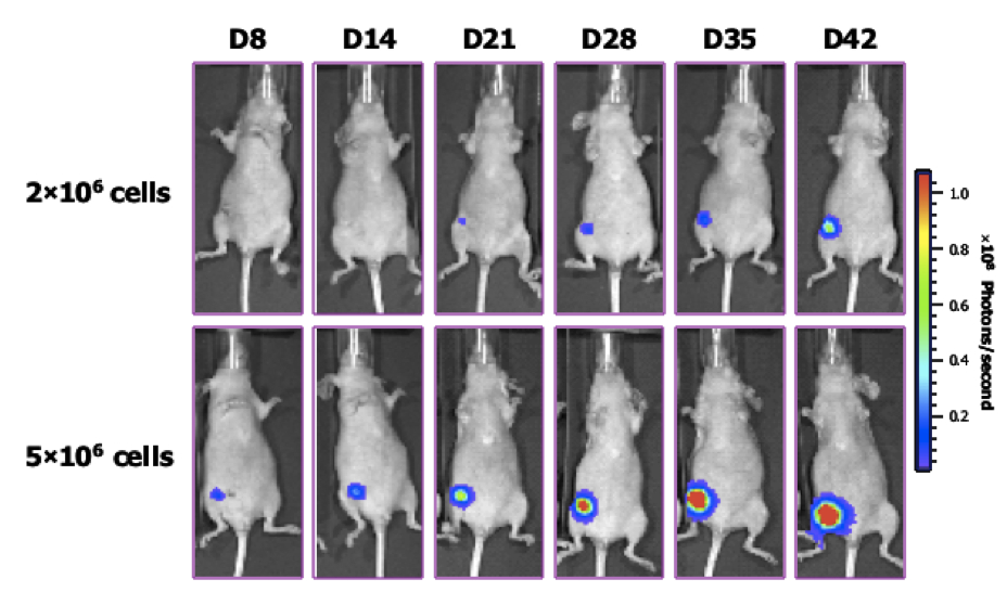 Figure 3. Orthotopic mammary fat pad tumor growth and spontaneous metastases of breast cancer cells with luciferase overexpression. Female mice received a orthotopic injection of 2 or 5x106 MDA-MB-231 cells and bioluminescence tumor growth was monitored over time using the IVIS® Spectrum This same model will be used for the therapeutic evaluation of the nanosystems developed within the ONCONANOTARGET Network.