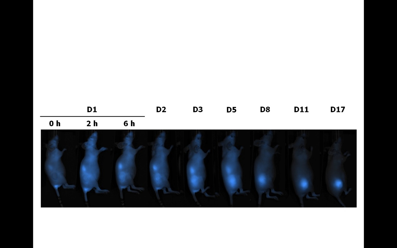 The in vivo platform has available a panel of tumor cell lines that overexpress bioluminescent and fluorescent proteins that allow the tracking of tumor progression in vivo by non-invasive optical imaging. As for the experimental animal models, tumor progression and spontaneous and experimental metastasis models are offered (see Table 1). In a special manner, some of these models allow the monitoring of disease progression, the treatment efficacy and/or the compound biodistribution by means of non-invasive optical imaging techniques (see Figure 2 and 3).