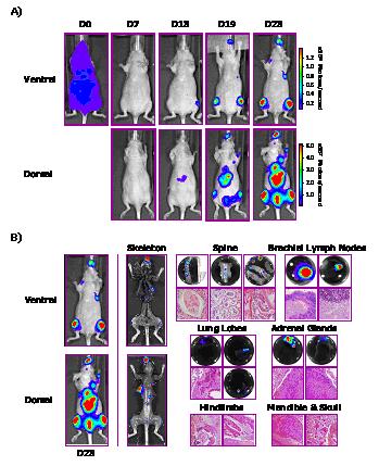 Figure 2. Intracardiac experimental metastases model (bone metastasis) of colon cancer cells injected into the left ventricle of mice heart. A) In vivo images of metastatic lesions of a representative mouse over time are shown. B) Ex vivo imaging and hitopathology confirmed metastases in various tissues including jaw, cervical lymph nodes, tibia or femur and thorax.